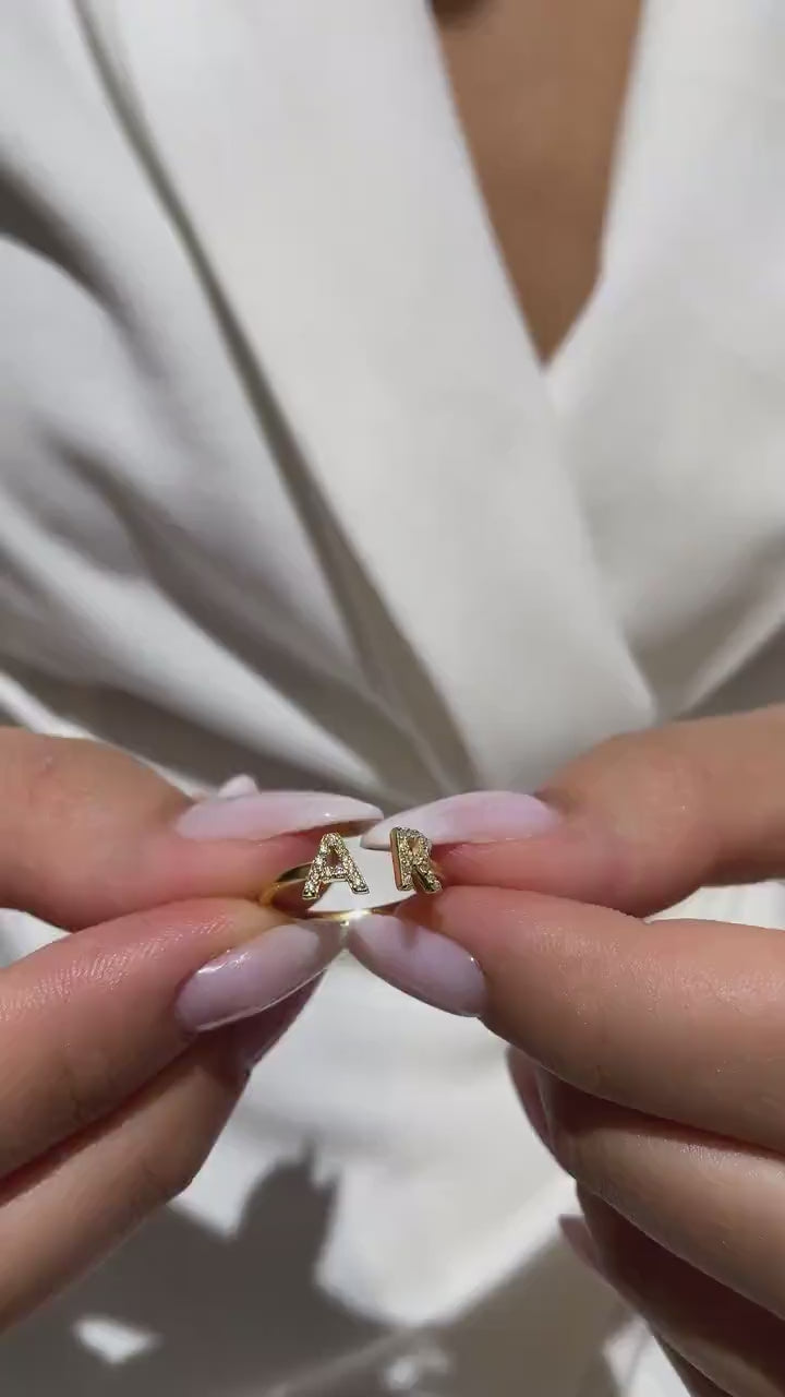 This beautiful initial band has 2 micro pavé set diamond initials and goes well around any stacking band.