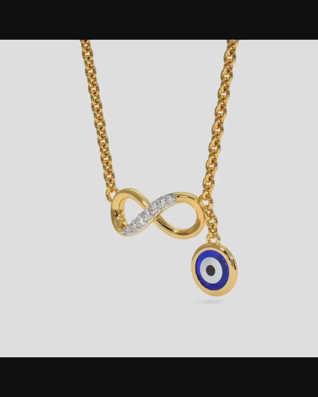 Dangling gracefully from the infinity charm is a vibrant blue evil eye pendant, a timeless symbol of protection and positive energy, Crafted in lustrous gold-tone metal, it features a stunning infinity symbol adorned with shimmering crystals, representing eternal love and connection.